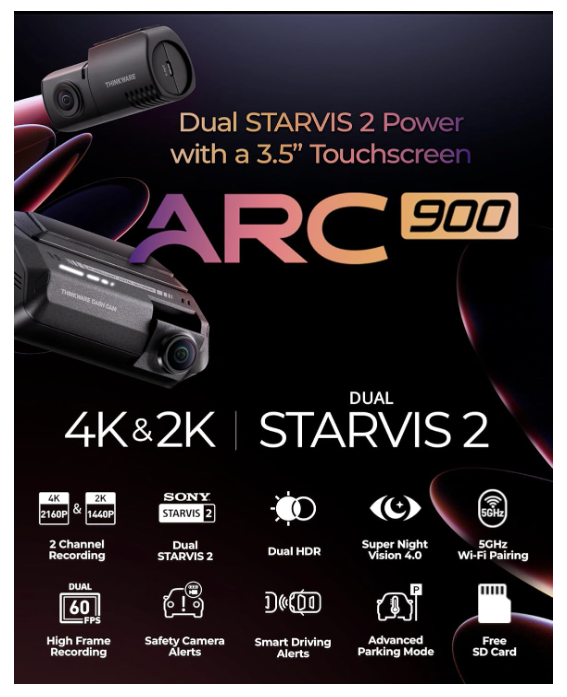 Powered by Sony’s STARVIS 2 image sensors – IMX678 up front and IMX675 in the rear – the ARC 900 delivers high-resolution video that captures fine detail with precision. From wide-open highways to complex cityscapes, every frame is sharp, balanced and built for clarity