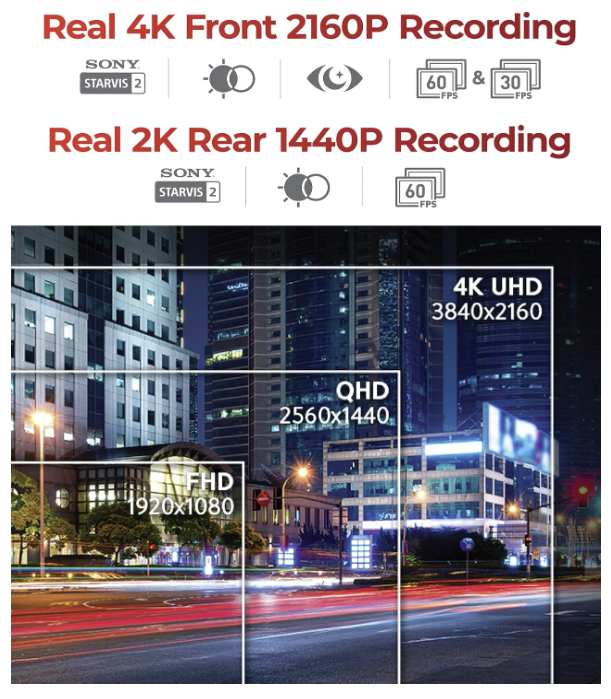 • Resolution: Front - 4K UHD (3840 x 2160p) @30 fps or QHD (2560 x 1440p) @60 fps Rear - 2K QHD (2560 x 1440p) @30 fps