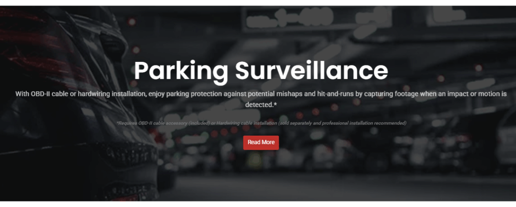 *Requires Hardwiring Cable or OBD II Power Cable and installation for Parking Surveillance Mode (professional installation recommended)
